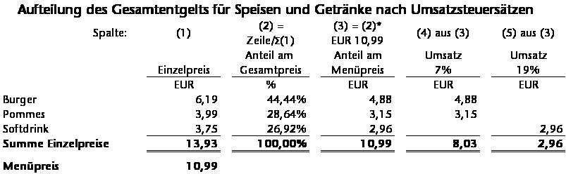 Beispiel: Aufteilung des Gesamtentgelts für ein Spar-Menü nach den Einzelverkaufspreisen Die vom BFH vorgesehene Aufteilung sei an einem fiktiven Zahlenbeispiel erläutert: Ein Schnellimbiss verkauft Burger, Pommes und Softdrinks zu den in Spalte (1) genannten Einzelpreisen (brutto). Das Menü würde demnach € 13,93 kosten. Als Spar-Menü muss der Kunde jedoch nur € 10,99 bezahlen. Bei der Aufteilung nach Einzelverkaufspreisen muss der Anteil am Gesamtpreis ermittelt werden (Spalte (2)). Der Prozentsatz, z.B. 44,44% für den Burger, wird auf den Menüpreis (€ 10,99) angewendet (Spalte (3)), z.B. 44,44% * € 10,99 = € 4,88 für den Burger. Hieraus ergeben sich - € 8,03 (brutto) für die Lieferung von Speisen mit 7,0% USt (4,88 € + 3,15 €) und