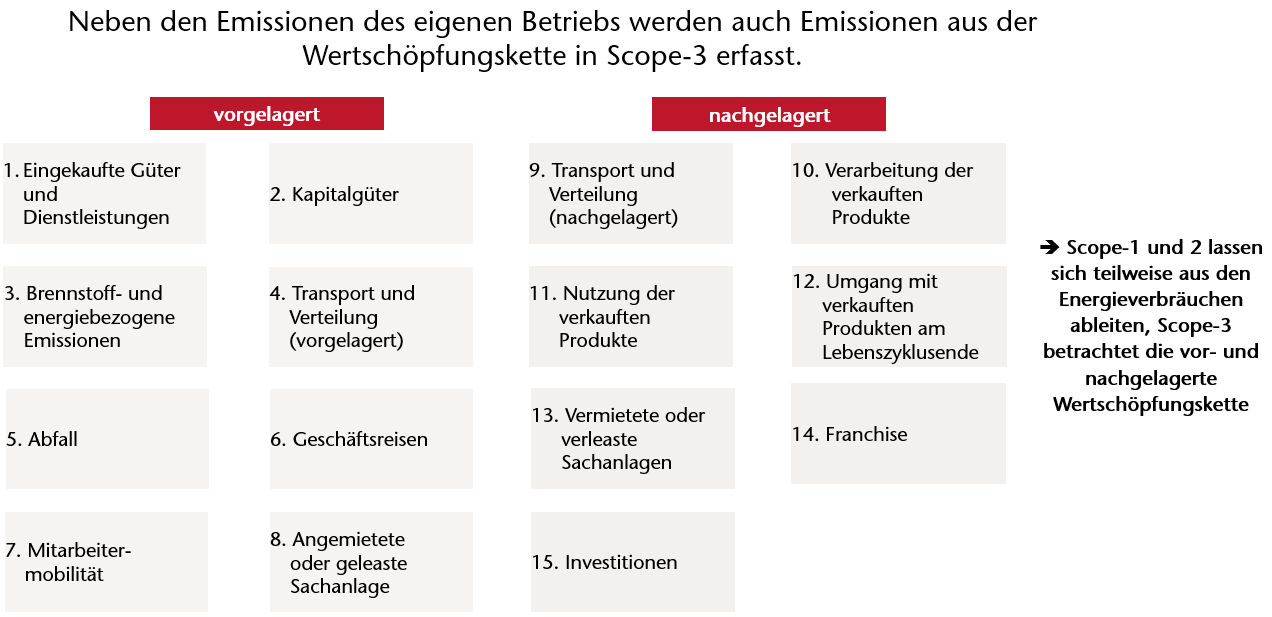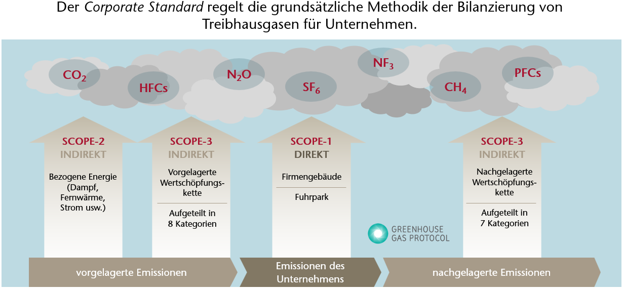 Der sog. Corporate Standard regelt die grundsätzliche Methodik der Bilanzierung von Treibhausgasen für Unternehmen. Unterschieden wird dort zwischen vorgelagerten, internen und nachgelagerten Emissionen. Vorgelagert ist im Scope-1 dann z.B. die Erfassung von Dampf, Fernwärme, Strom. Neben CO2 werden auch andere Gase berücksichtigt wie z.B. Methan.