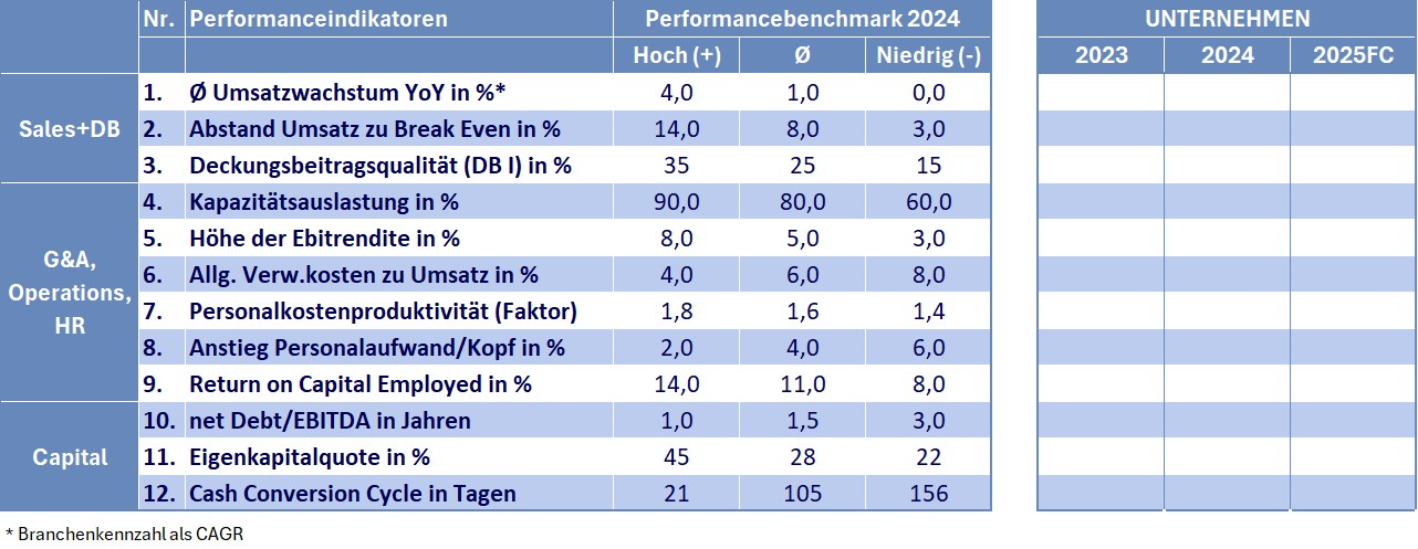 (4) Zu empfehlen ist die Konzentration auf 12 Performance-Indikatoren: Umsatzwachstum, Deckungsbeitragsqualität, Kapazitätsauslastung, Personalkostenproduktivität etc.