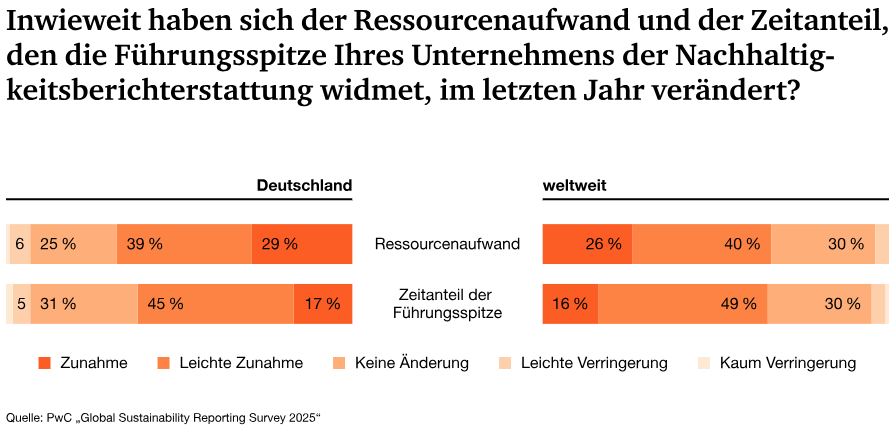 • Auch die Zeit, die Führungskräfte für Nachhaltigkeitsberichterstattung aufwenden, ist deutlich gestiegen.