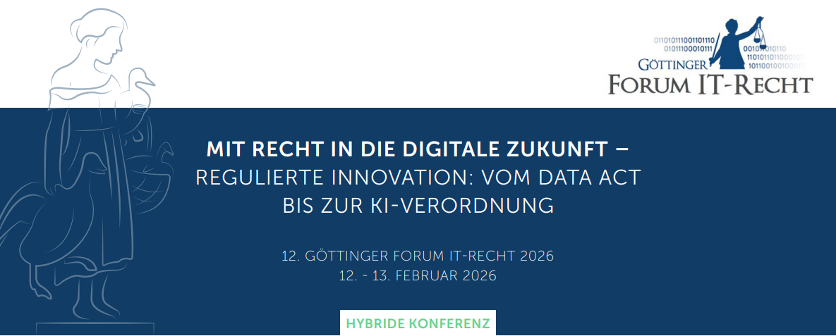 Am 12. und 13.2.2026 findet das 12. Göttinger Forum IT-Recht zum Thema „Mit Recht in die digitale Zukunft - Vom Data Act bis zur KI-Verordnung: Rechtliche Steuerung der digitalen Transformation“ in der Alten Mensa in Göttingen statt. Führende Expert*innen aus Wissenschaft und Praxis werden zu hochaktuellen Themen diskutieren und ihre Lösungsansätze vorstellen.
