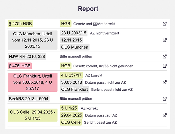 Der Bericht enthält zudem eine ausführliche Tabelle, die die Verweise in die Bestandteile zerlegt und einzeln bewertet. Bei einer Gerichtsentscheidung kann es beispielsweise sein, dass ein existentes Aktenzeichen nicht zu dem angegebenen Datum der Entscheidung passt.